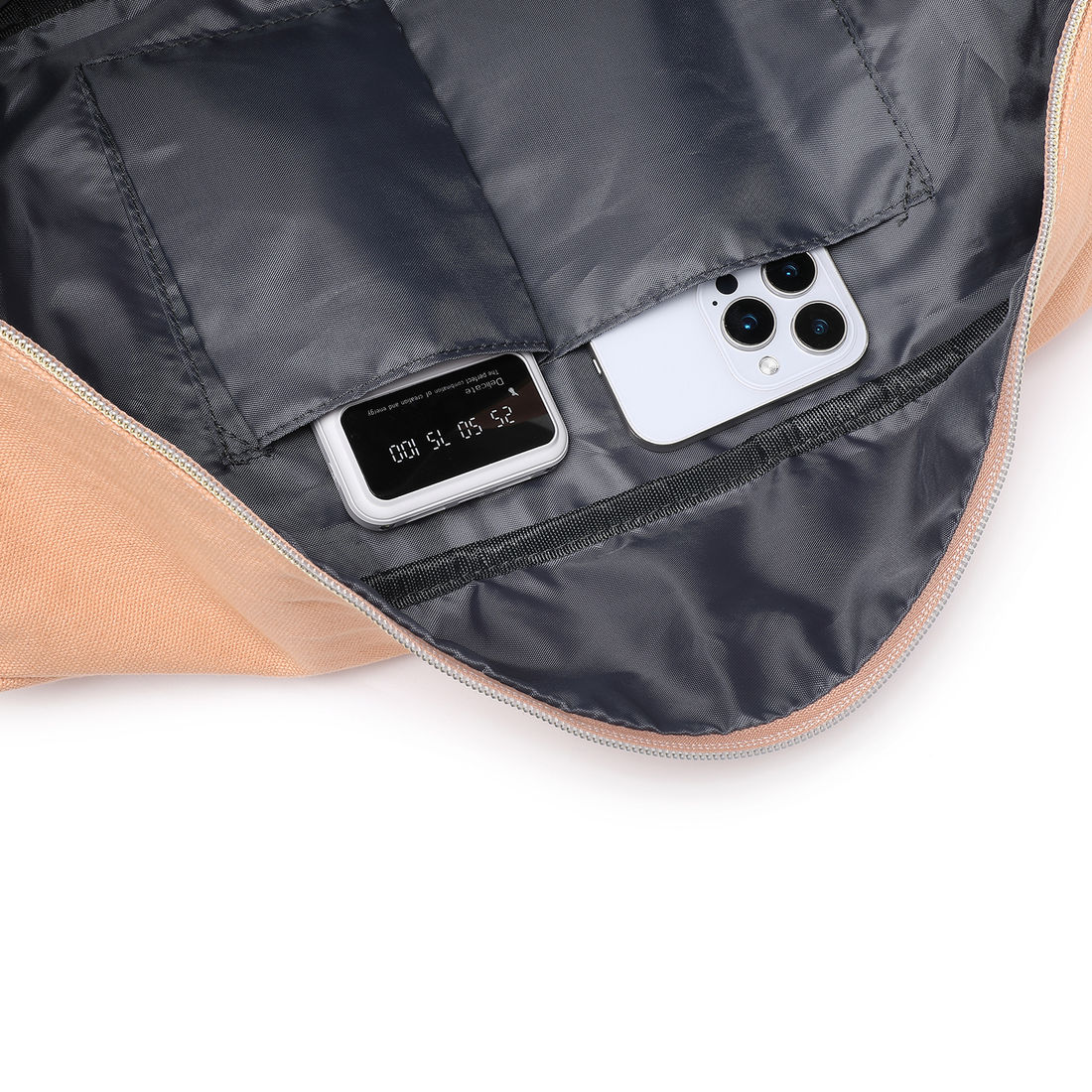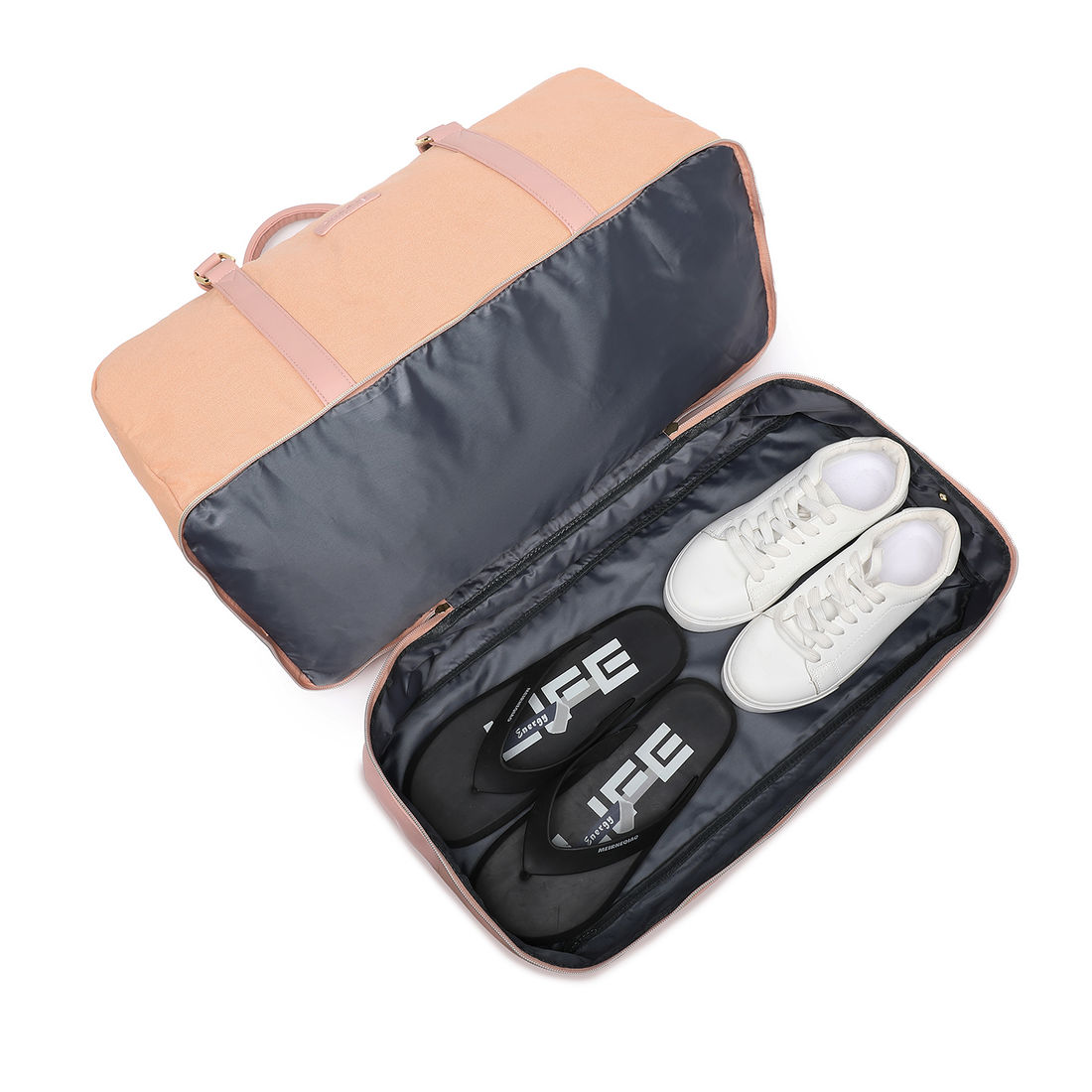 Compartimento Superior: Grande espaço principal com zíper duplo, perfeito para roupas e itens essenciais.