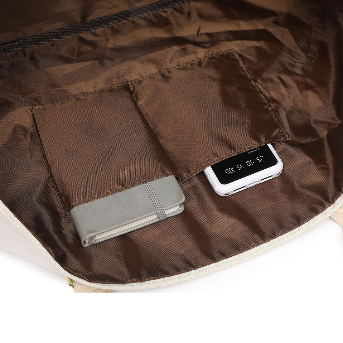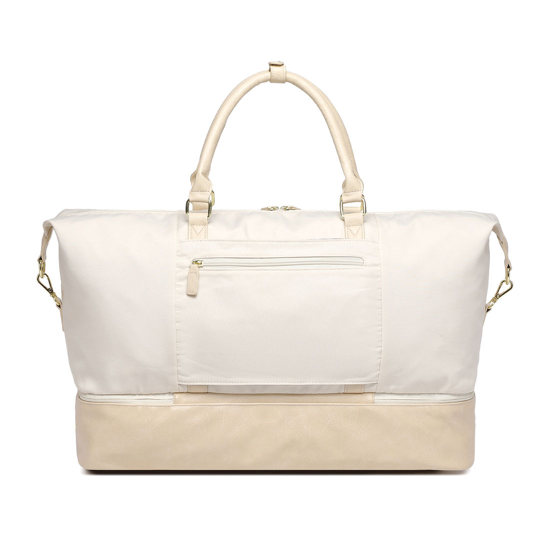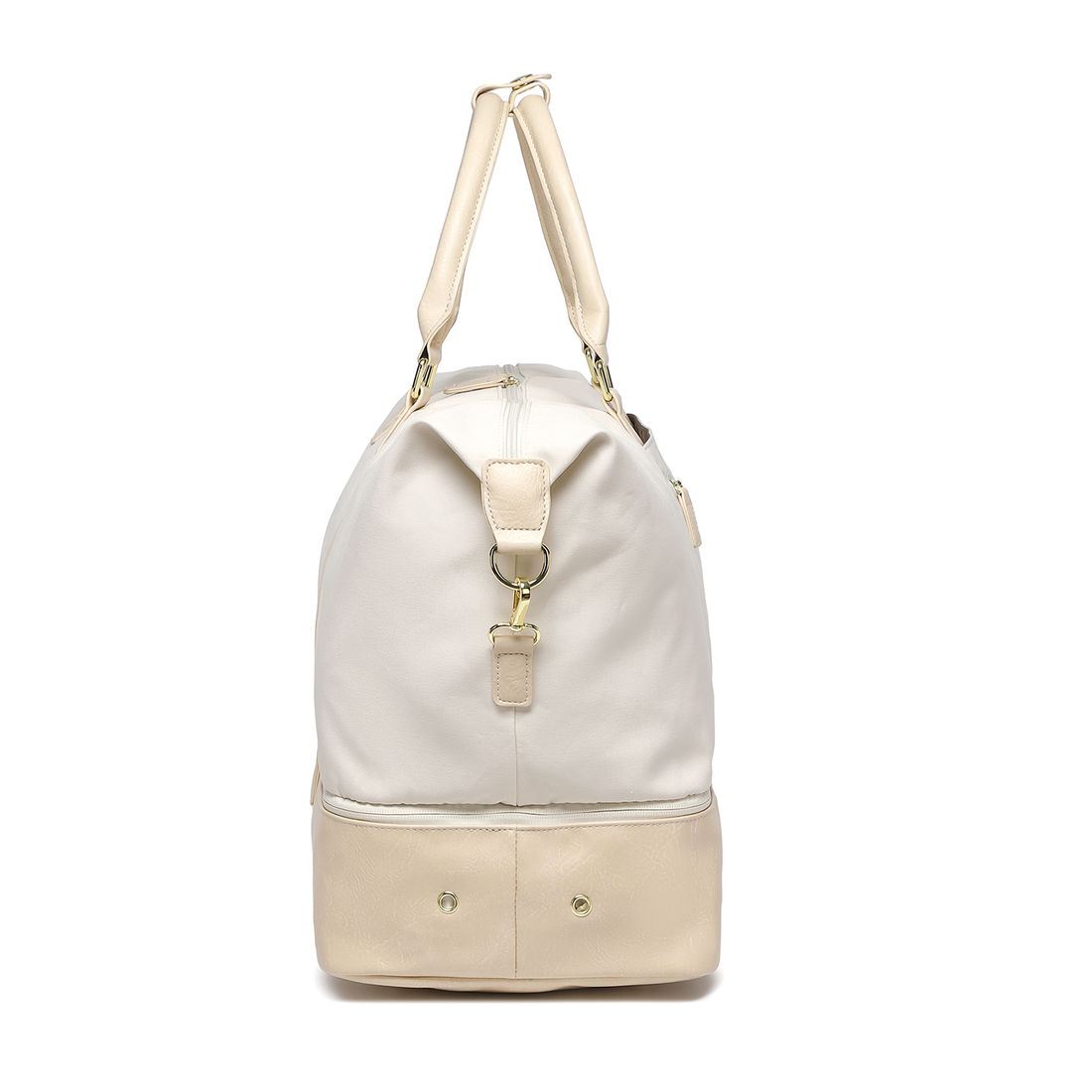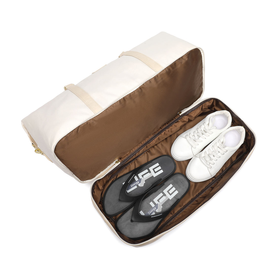 Compartimento Exclusivo para Sapatos: Um compartimento fechado na parte inferior da bolsa, ventilado por pequenos furos, permite armazenar sapatos separadamente, evitando odores e mantendo suas roupas limpas e organizadas.