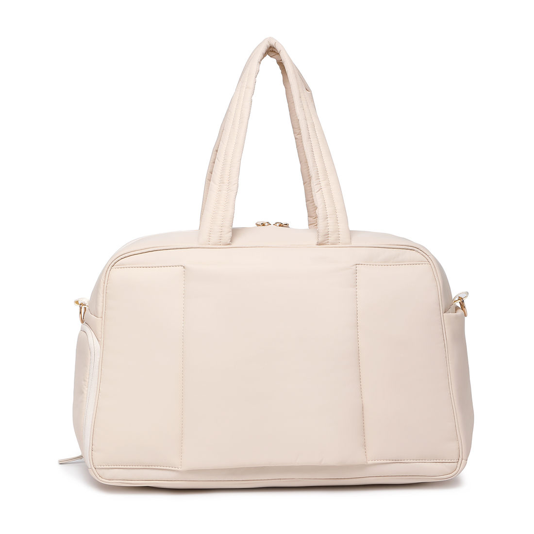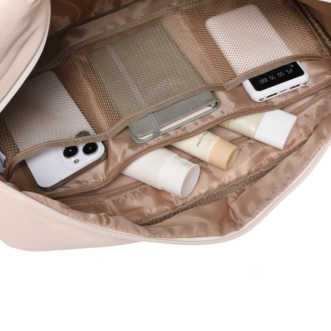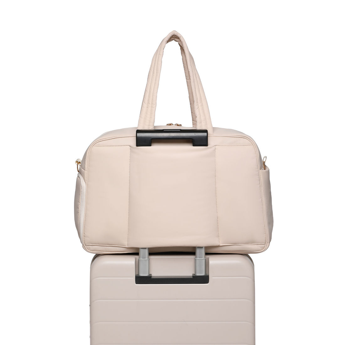Na parte traseira, o encaixe tipo “alça carona” permite acoplar a bolsa facilmente à mala de viagem, proporcionando mais comodidade nos deslocamentos.