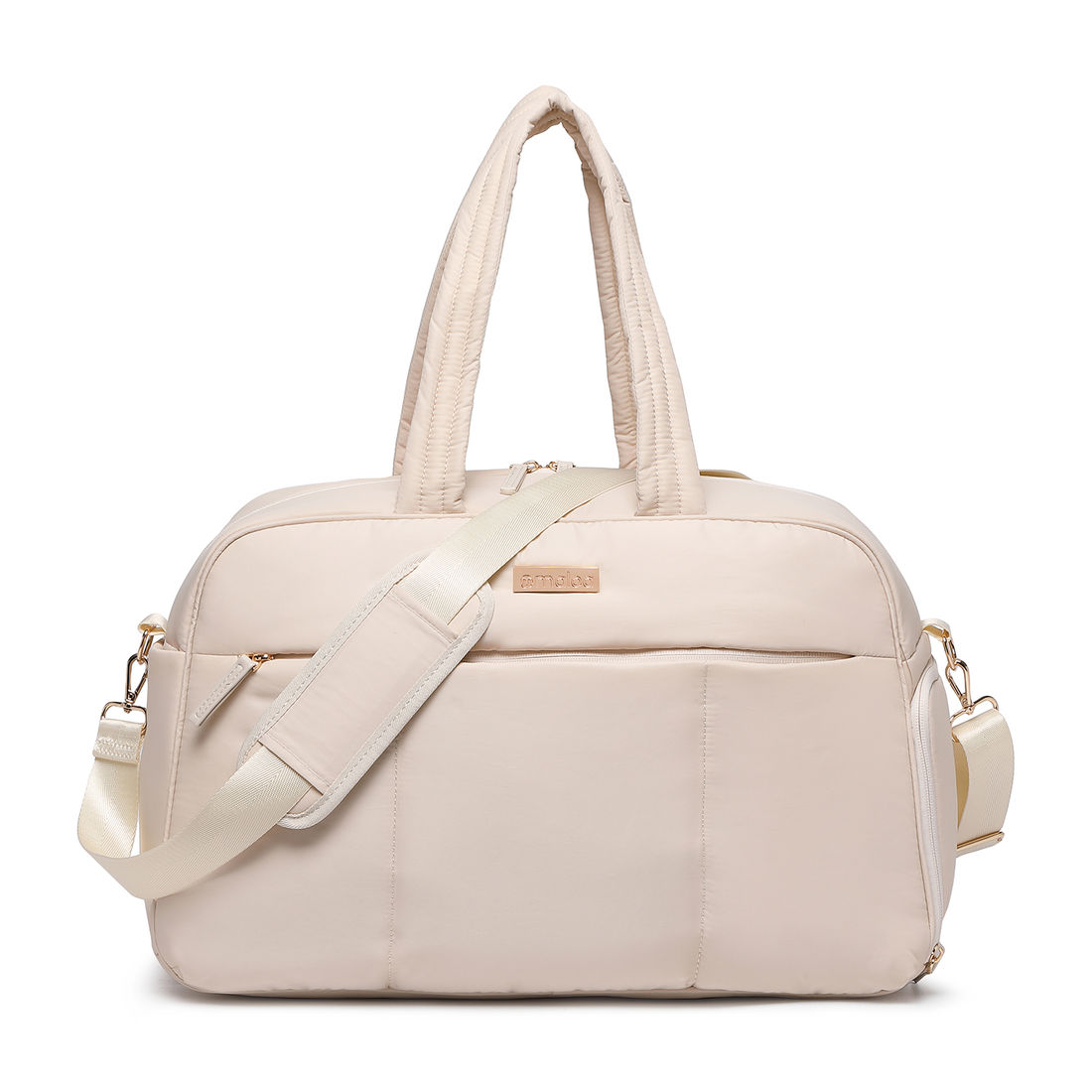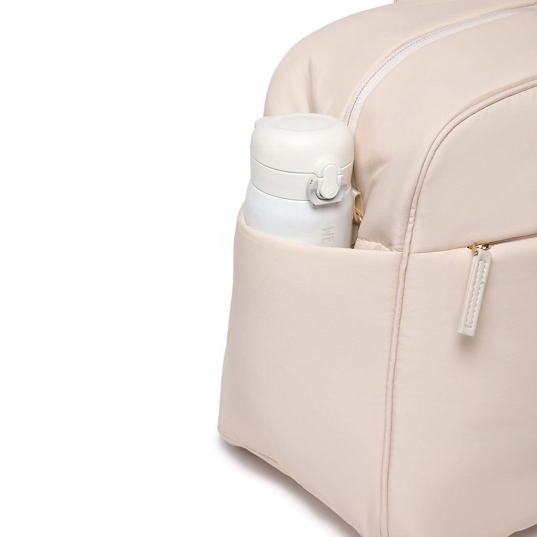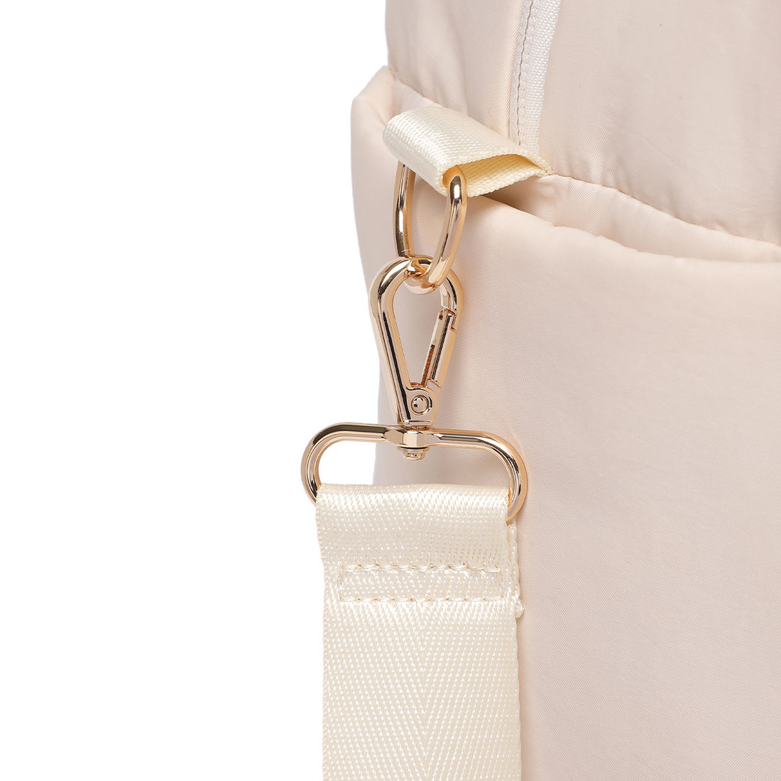Na parte traseira, o encaixe tipo “alça carona” permite acoplar a bolsa facilmente à mala de viagem, proporcionando mais comodidade nos deslocamentos.