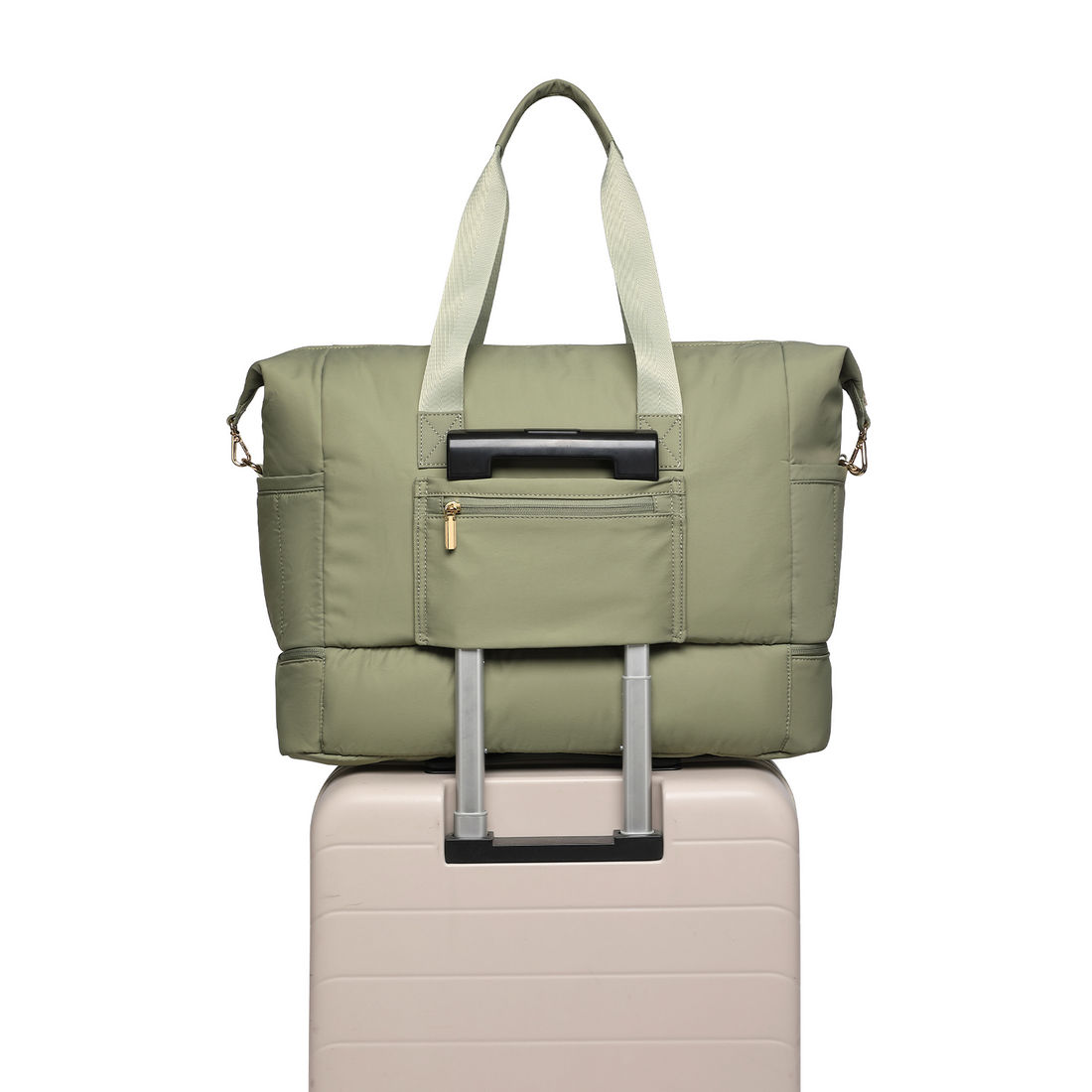 Na parte traseira, possui 1 bolso pequeno com zíper e alça carona, permitindo acoplar a bolsa facilmente à alça retrátil das malas, tornando o transporte mais prático e confortável.