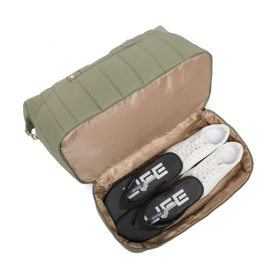 1 bolso inferior amplo com fechamento em zíper, projetado para separar calçados ou roupas usadas sem comprometer o restante da bagagem.