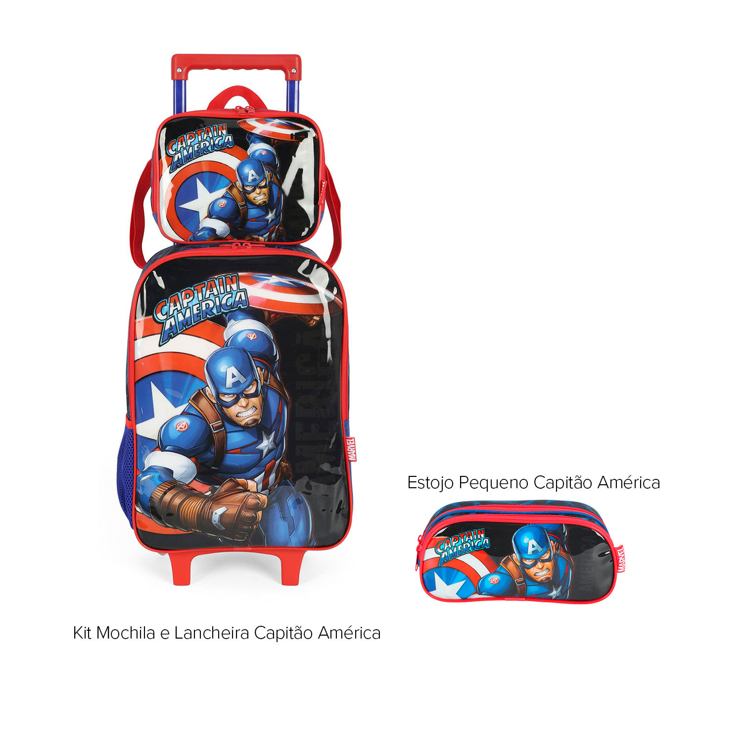 Ideal para os pequenos fãs do Capitão de América, este kit bolsa com rodinhas e lancheira combina praticidade e resistência com o estilo único do heroi, Composto por uma bolsa funcional com uma lancheira térmica e estojo, este kit oferece tudo o que seu pequeno precisa para carregar seus materiais escolares e lanches com muito estilo e praticidade. O design vibrante do Capitão América, aliado a materiais resistentes e confortáveis, garante durabilidade e facilidade no transporte, tanto da mochila quanto da lancheira.
