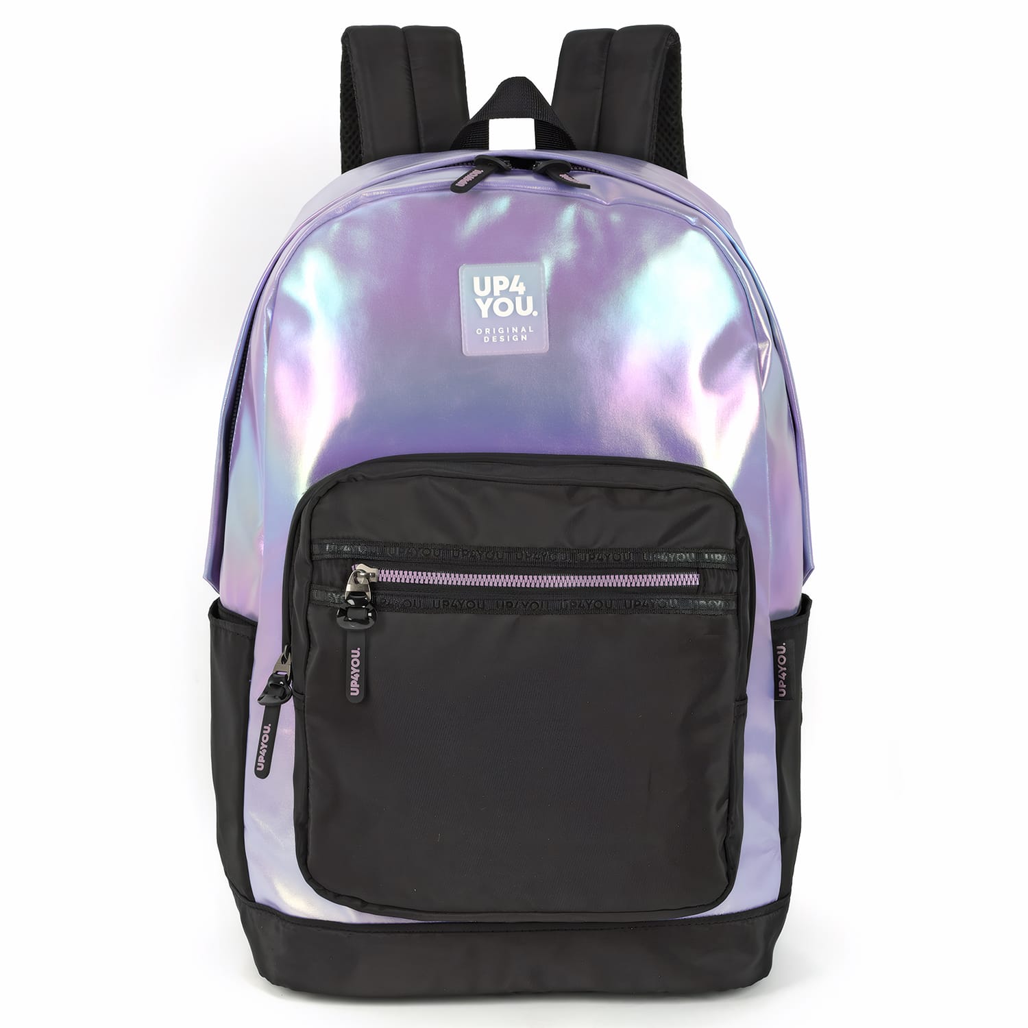 Efeito Metálizado: O acabamento metalizado dá à mochila um brilho único que reflete diferentes tons, criando um visual futurista e chamativo.